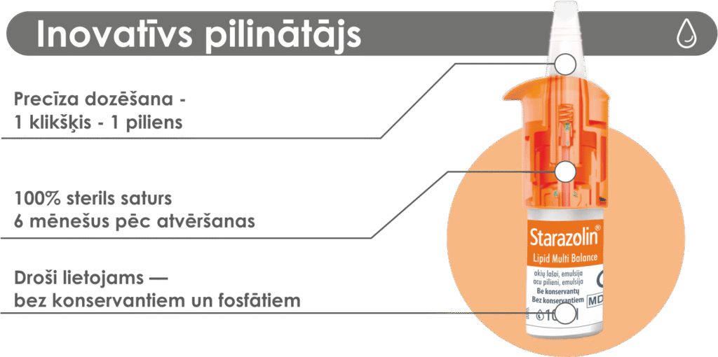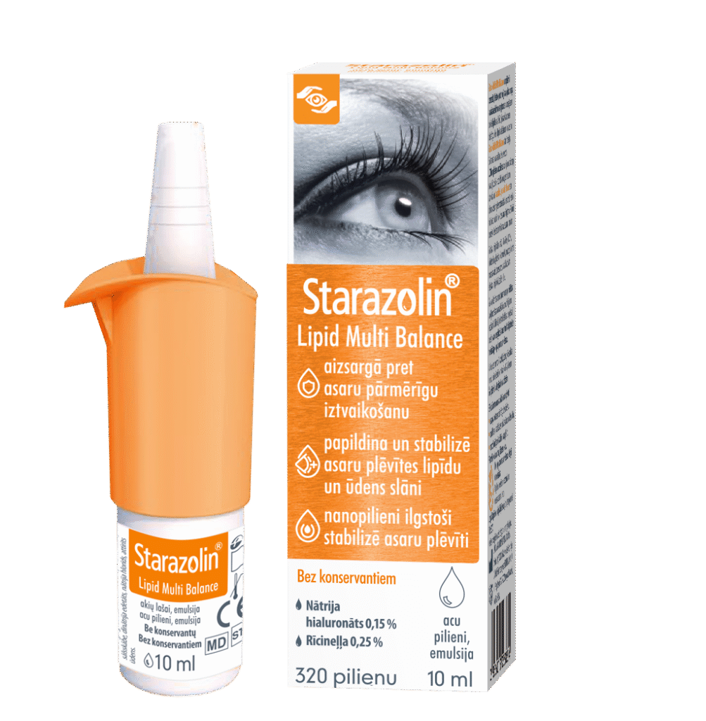 Starazolin® Lipid Multi Balance acu pilieni ir paredzēti vidēji smaga līdz smaga sausās acs sindroma simptomu atvieglošanai. Šie pilieni atjauno asaru plēvītes lipīdu slāni, stabilizē asaru plēvīti un optimāli mitrina acs virsmu.